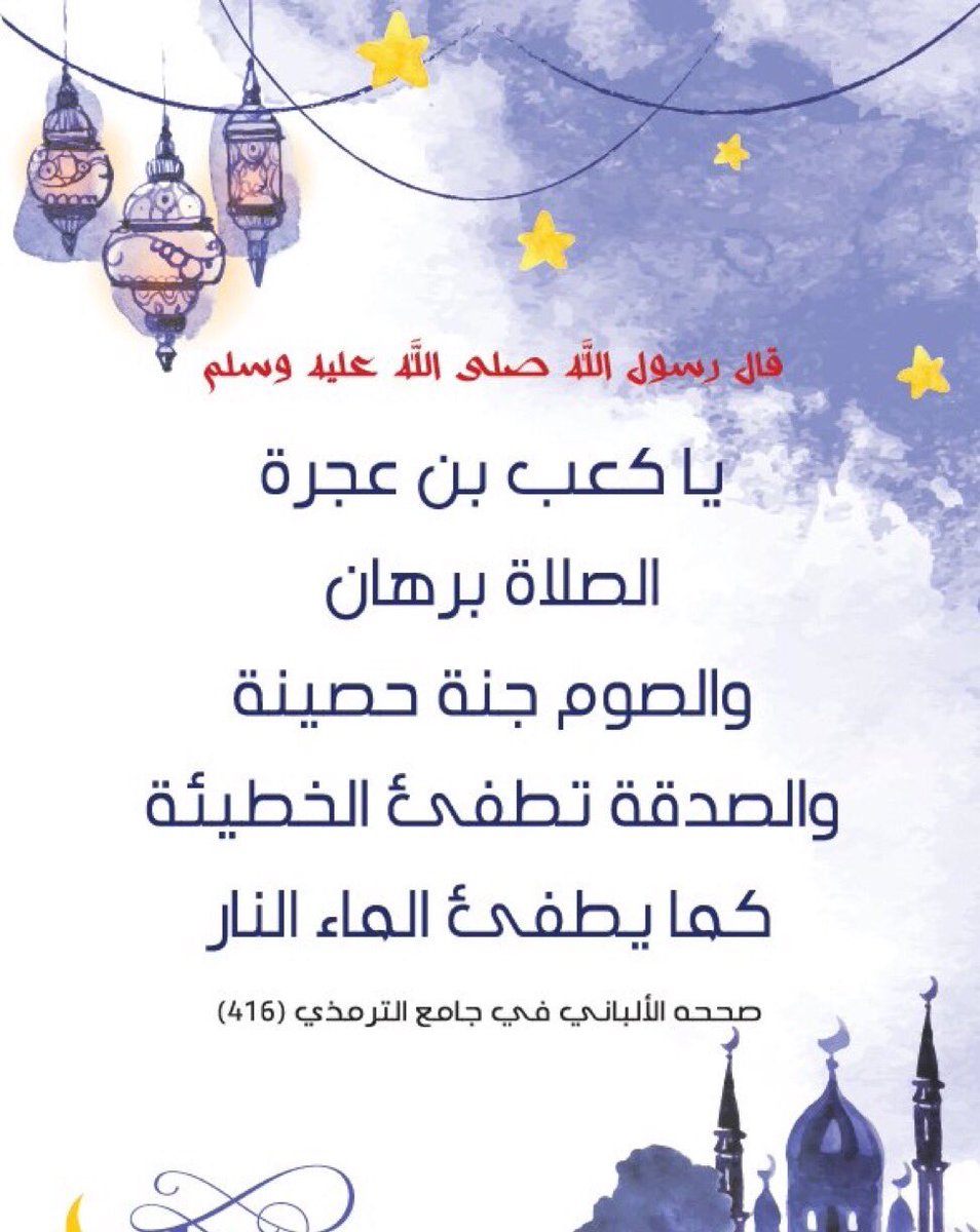 الصلاة برهان والصوم جنة حصينة والصدقة تطفئ الخطيئة كما يطفئ الماء النار تويت حديث رمضان