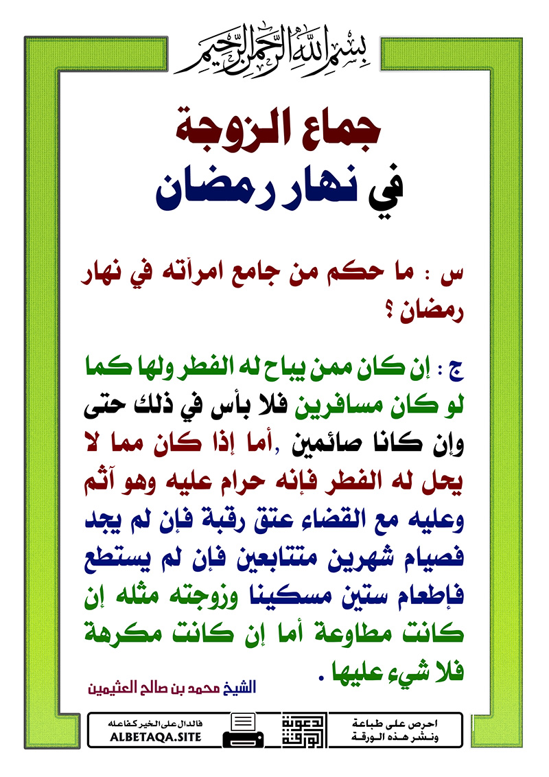جماع الزوجة في نهار رمضان موقع البطاقة الدعوي